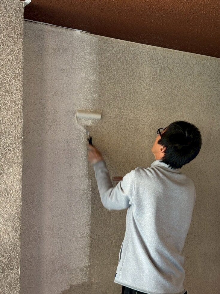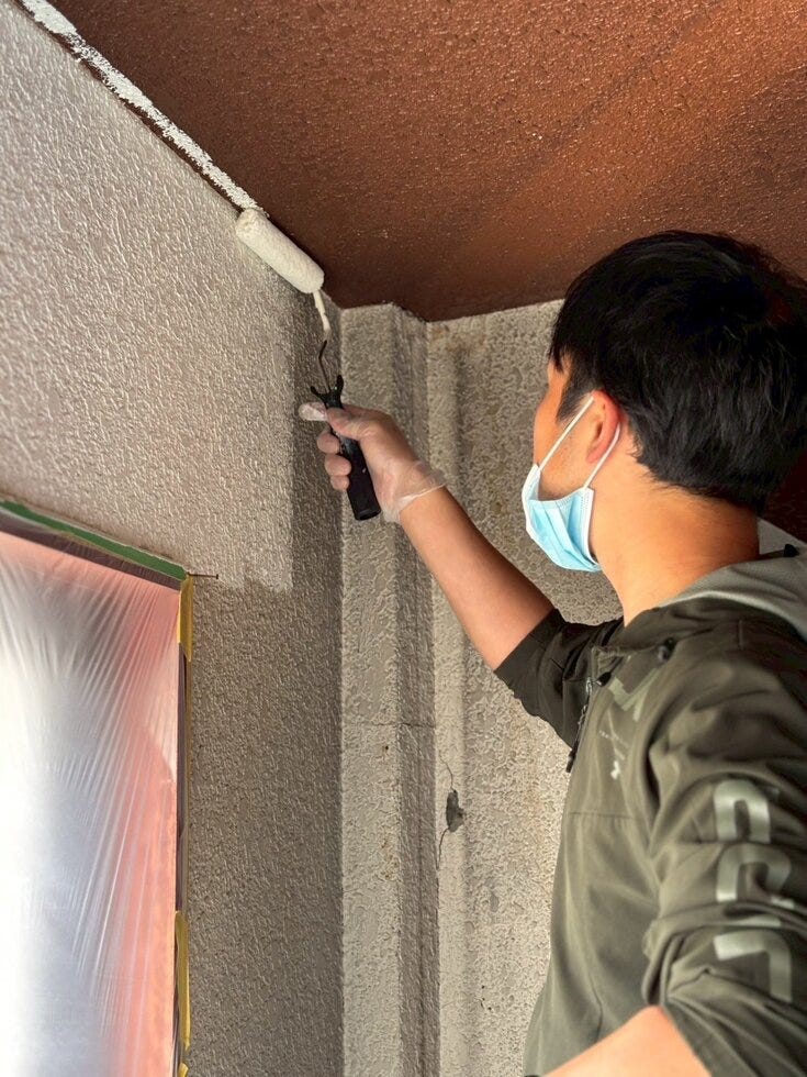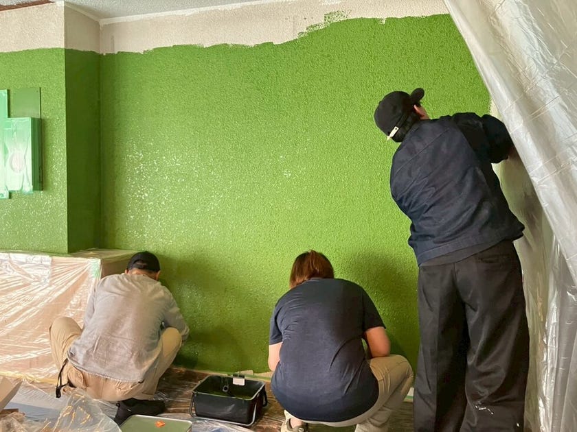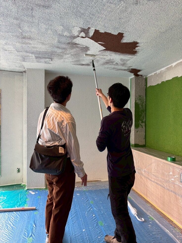 当日は、お客様や友人、スタッフなど総勢50名ほどが集まり、天井や壁にペンキを塗る作業を体験🎨